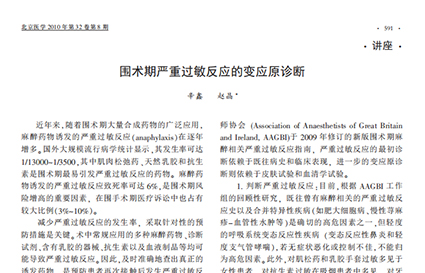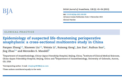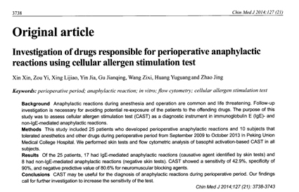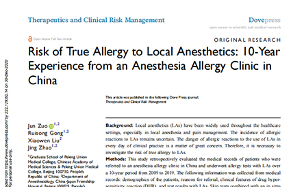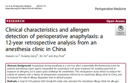赵晶教授是我国围术期过敏反应领域的先行者,在国内率先采用嗜碱性粒细胞活化试验(basophil activation test, BAT)用于围术期致敏原检测,并联合皮肤试验方法,现已对近两百人次围术期过敏患者进行麻醉药物致敏原检测。其中,近三分之一的患者接受了再次手术麻醉,在采用了安全的麻醉替代药物后均安全麻醉,无一例再次出现过敏反应。作为目前国内唯一具有进行围术期致敏原检测能力的团队,赵晶带领课题组在国内开创性的研究获得了国内学术界的一致认可,成果已被中华麻醉学会的专家共识引用。赵晶教授牵头了全国围术期过敏反应流行病学调查,首次揭示了我国严重过敏反应的发生率及地区差异。另外,发现围术期过敏不良结局的相关危险因素。赵晶教授团队还发现了我国围术期过敏反应的过敏谱,指出肌松药是主要的围术期过敏原。关于围术期过敏反应的研究已先后获得四项省部级科研项目支持。赵晶教授希望,通过这些研究实现临床转化,其最终目的是帮助患者识别过敏原,再次安全手术,让过敏不再成为制约患者治疗疾病的障碍。